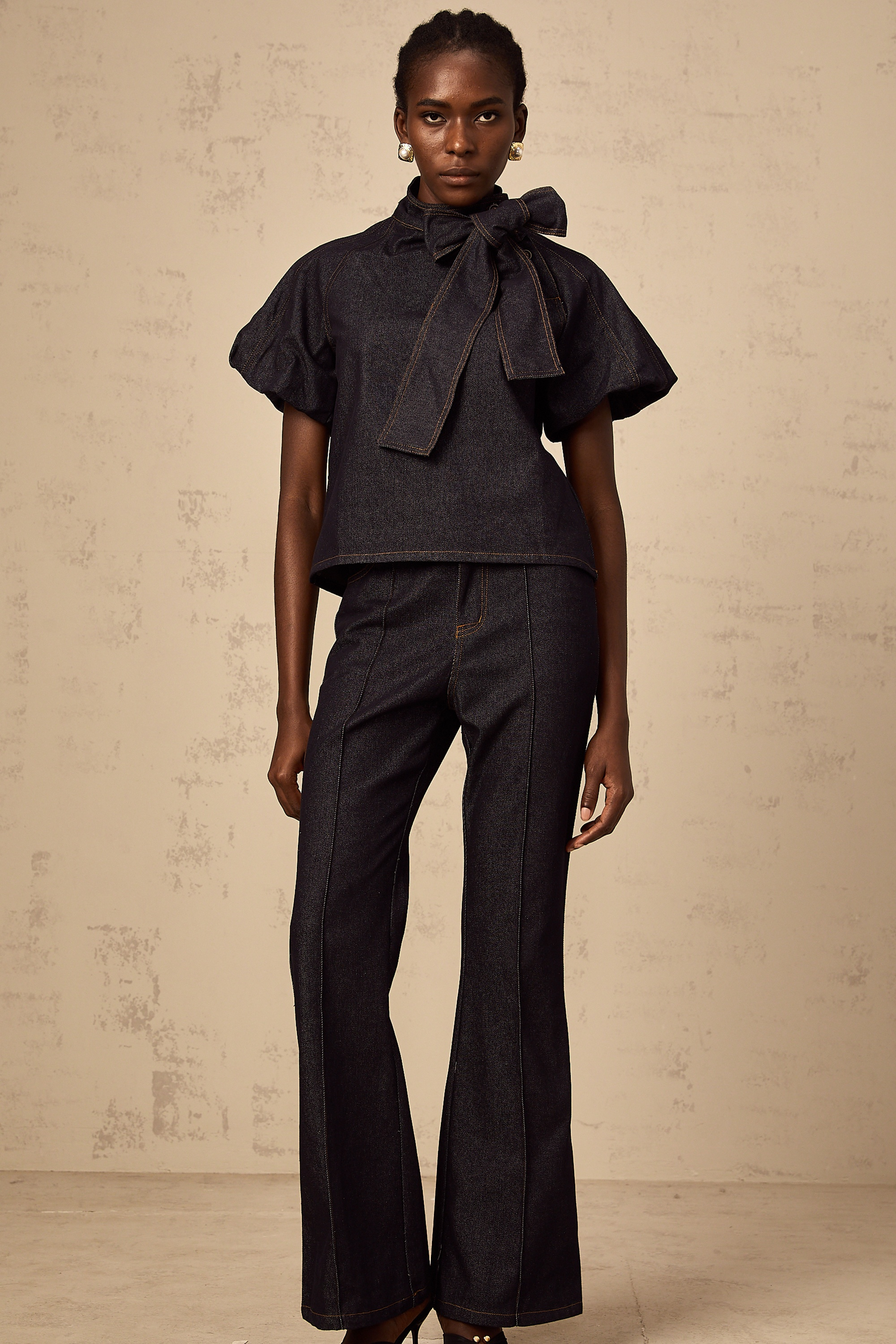 Roxane indigo-blue contrast-stitching denim blouse & jeans matching set