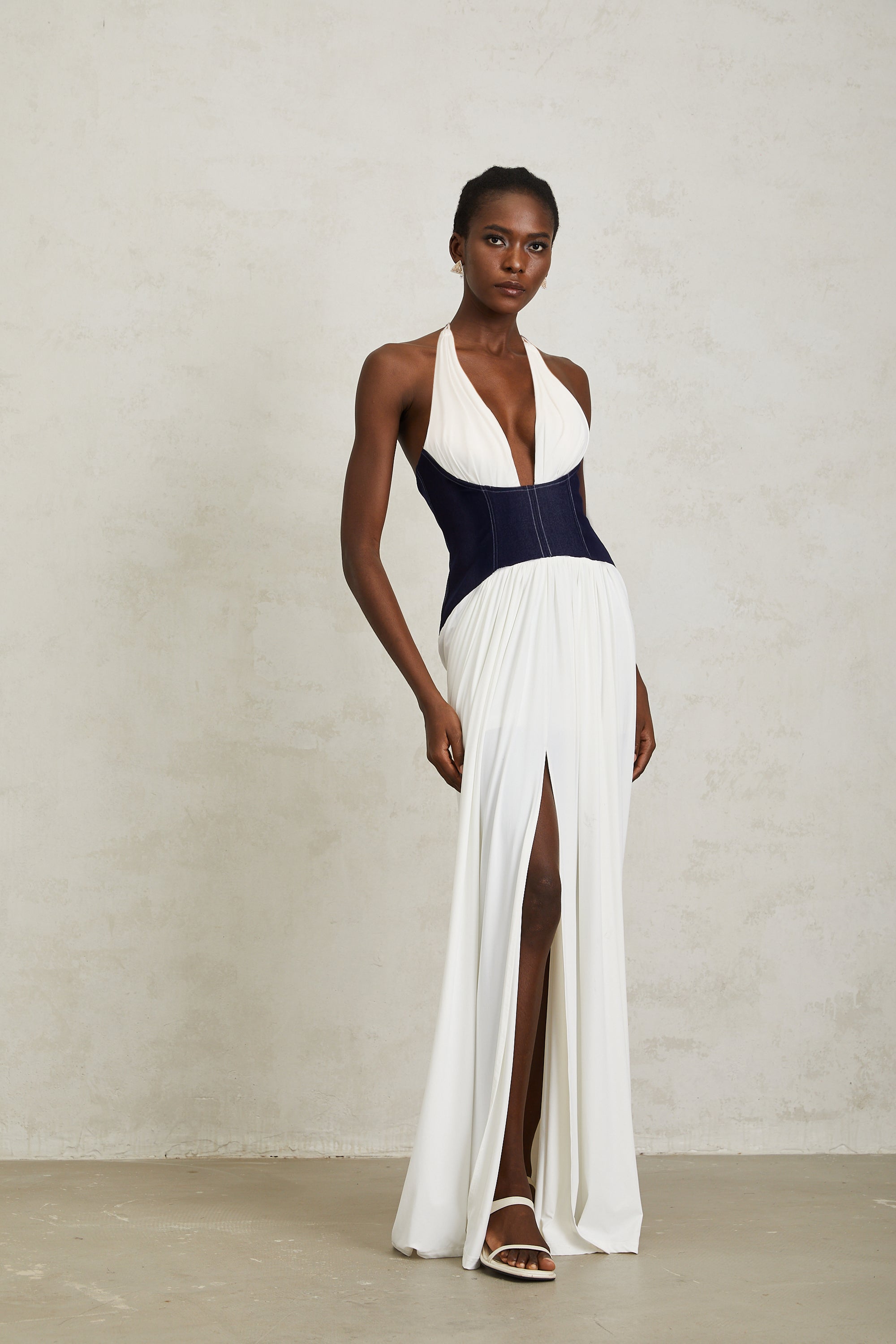 Airi White Halterneck Denim Panel Maxi Dress